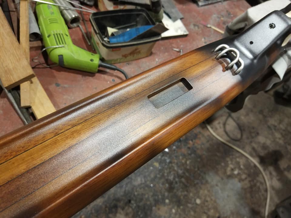 The finish that I prefer which most highlights the nobility of the materials used. Several sessions of sanding and epoxy application are necessary to arrive at the final result. On this finish the carbon remains used at the level of the head and the handguard to reinforce the passage of the pulleys and the fixing of the handle and the reel on the barrel.